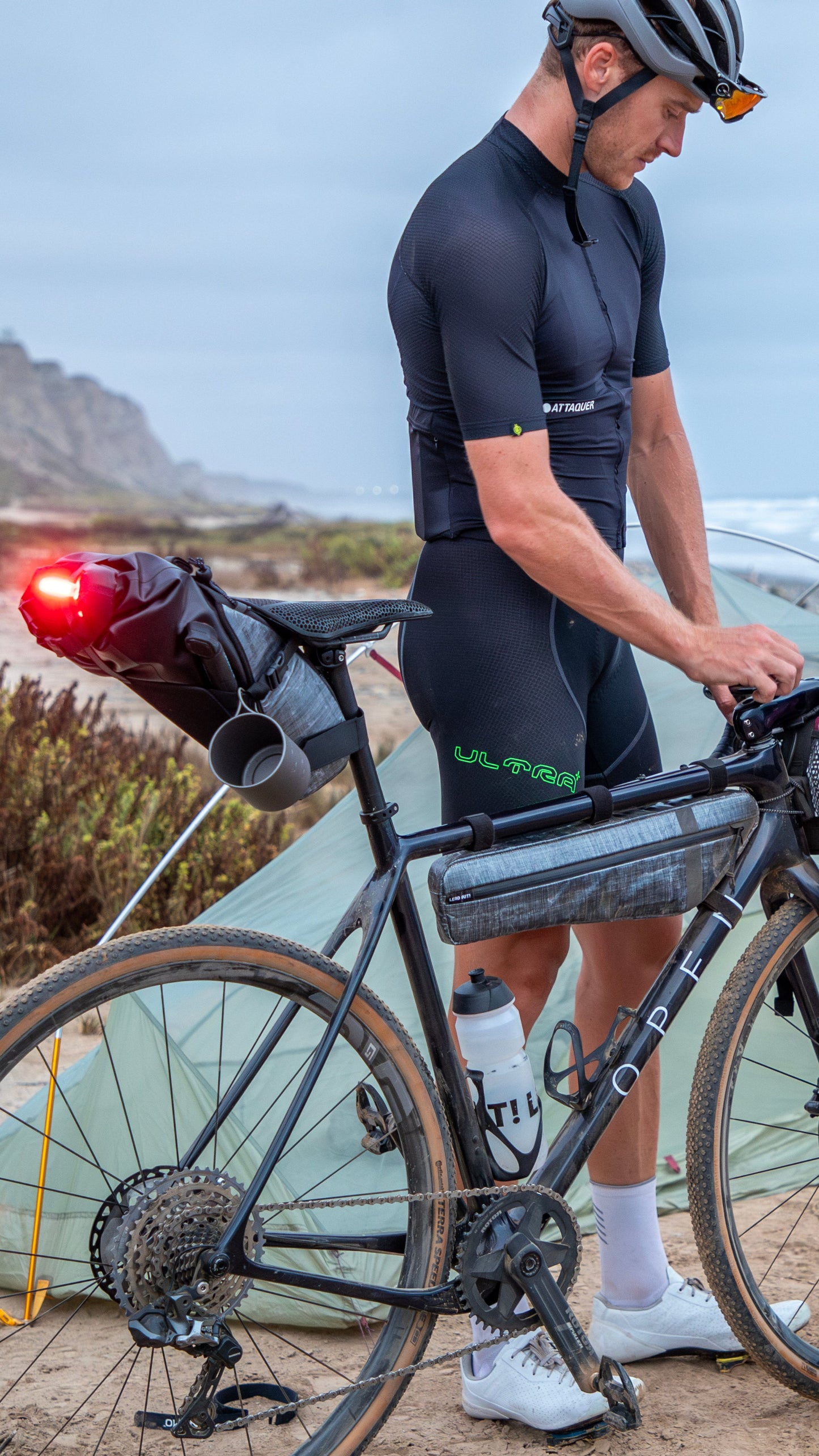 10.5 L of sway-free overnight carry. Dyneema® outside, VX21 X-Pac® inside—ultralight, waterproof, and built for seasons of gravel, mud, and rain. A roll-top dry bag with welded seams and an air-release valve compresses your sleep kit and layers tight. Hardshell mount locks under the saddle, tapered shape clears your legs. Side snack pocket, top bungee for a jacket, Hypalon gear loops, and reflective hits for night rides. 478 g. Ride all day. Sleep out. Go again.
